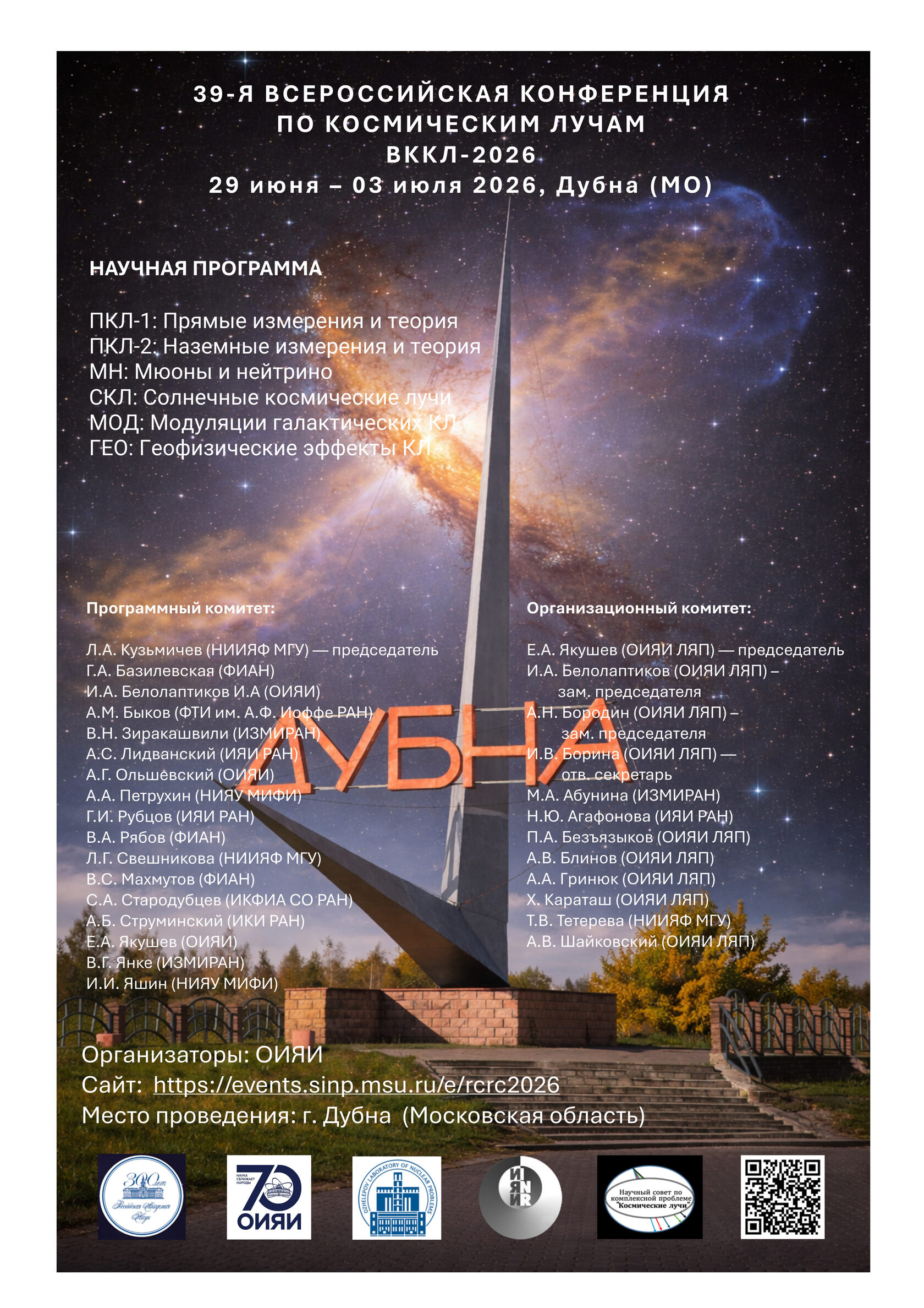 С 29 июня по 3 июля 2026 года в г. Дубна Московской области будет проведена 39-Я ВСЕРОССИЙСКАЯ КОНФЕРЕНЦИЯ ПО КОСМИЧЕСКИМ ЛУЧАМ.